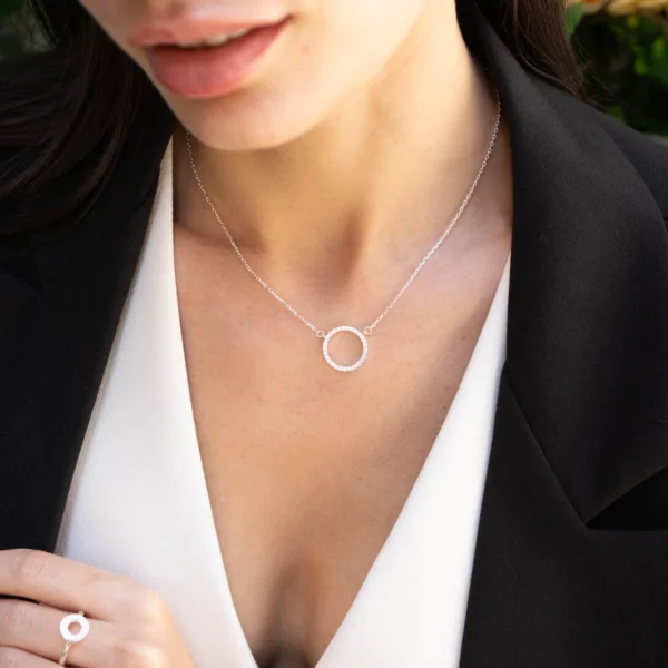Кольє «Душа» зі срібла 925 проби — стильна прикраса з круглою підвіскою, інкрустованою фіанітами. Мінімалістичний дизайн робить його універсальним вибором для щоденного носіння та особливих випадків. Виріб доступний у стандартних розмірах 40+5 см, 45+5 см, а також можливе виготовлення індивідуальної довжини. Вага прикраси становить ≈4,35 г та ≈4,56 г залежно від розміру. Кольє пакується у фірмову коробочку та відповідає усім ювелірним стандартам України.